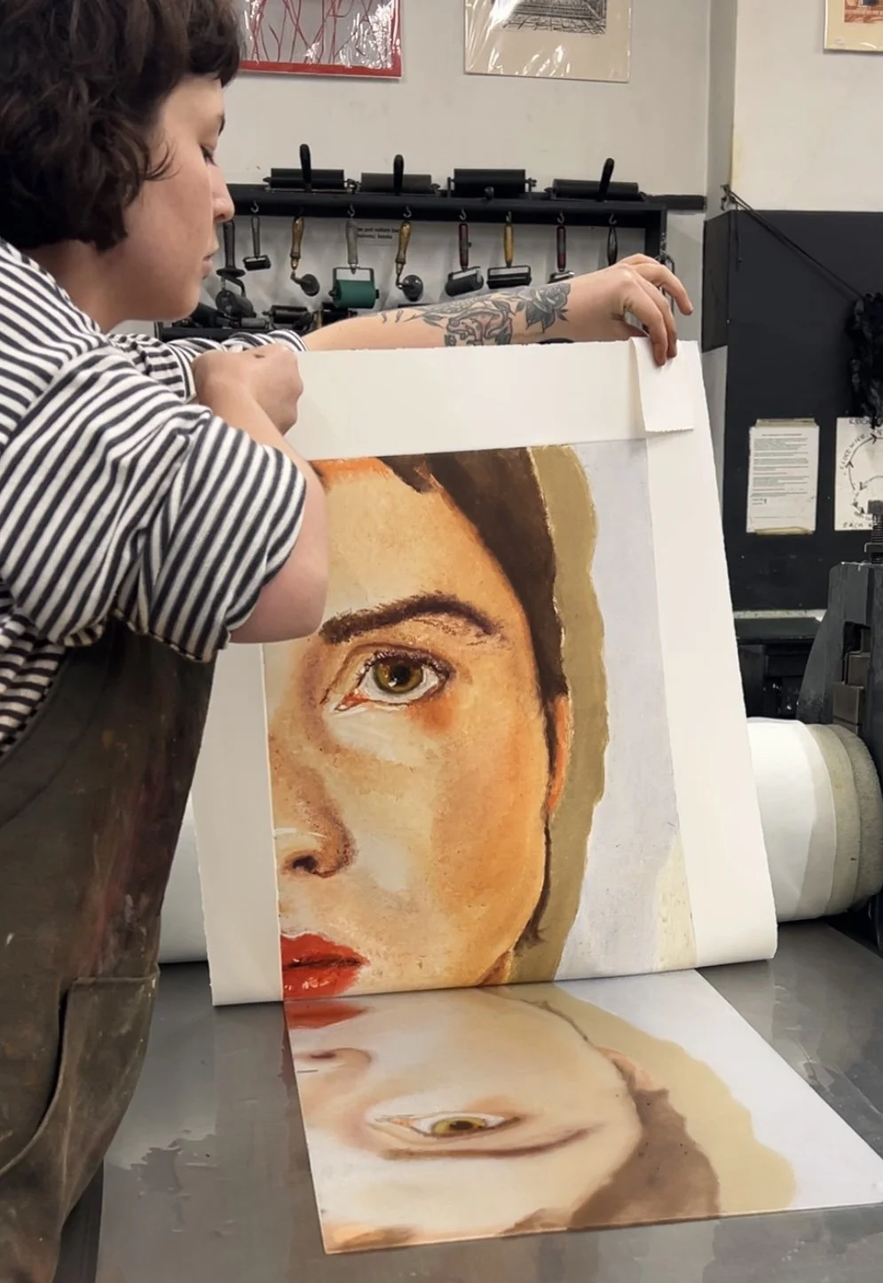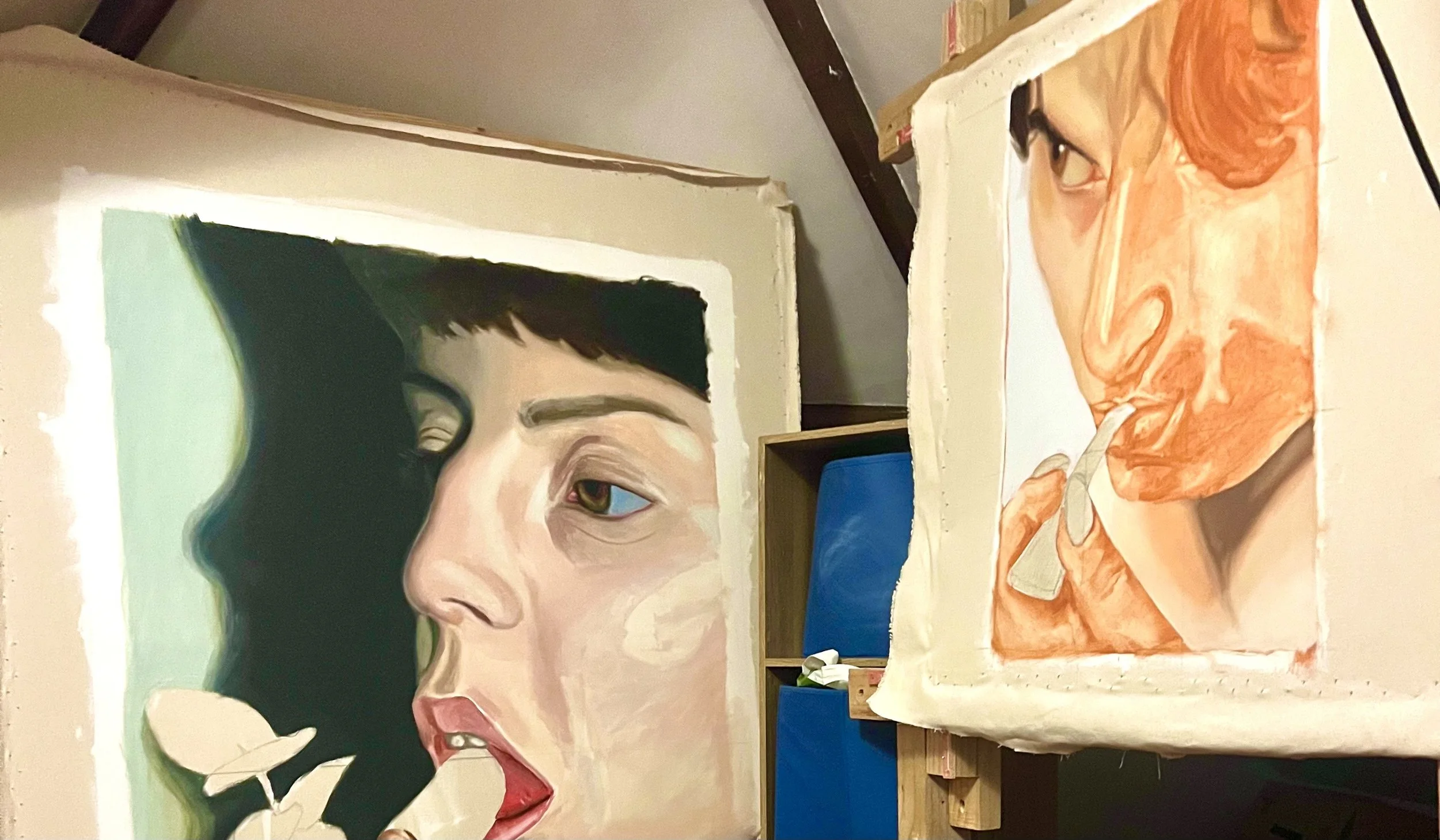 Erin Rosalie Thomas is a painter and printmaker whose practice explores emotional nuance, body language, and facial expression as primary forms of communication. Her work focuses on hyper-zoomed perspectives of the human face and body, examining the subtle moments where emotion and expression converge. By isolating the face from its external context, Erin creates surreal, intimate compositions drawn from everyday actions and emotions. These cropped perspectives invite viewers to reconsider what might be overlooked with excessive visual information. She encourages a deeper engagement with the human experience, positioning the viewer in an unbounded and voyeuristic encounter with another person’s inner world.